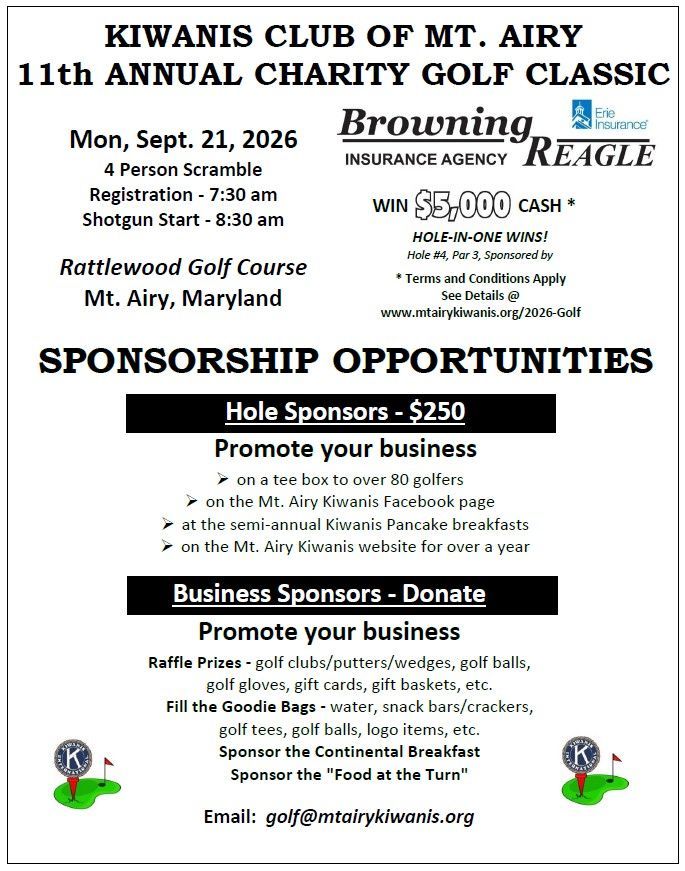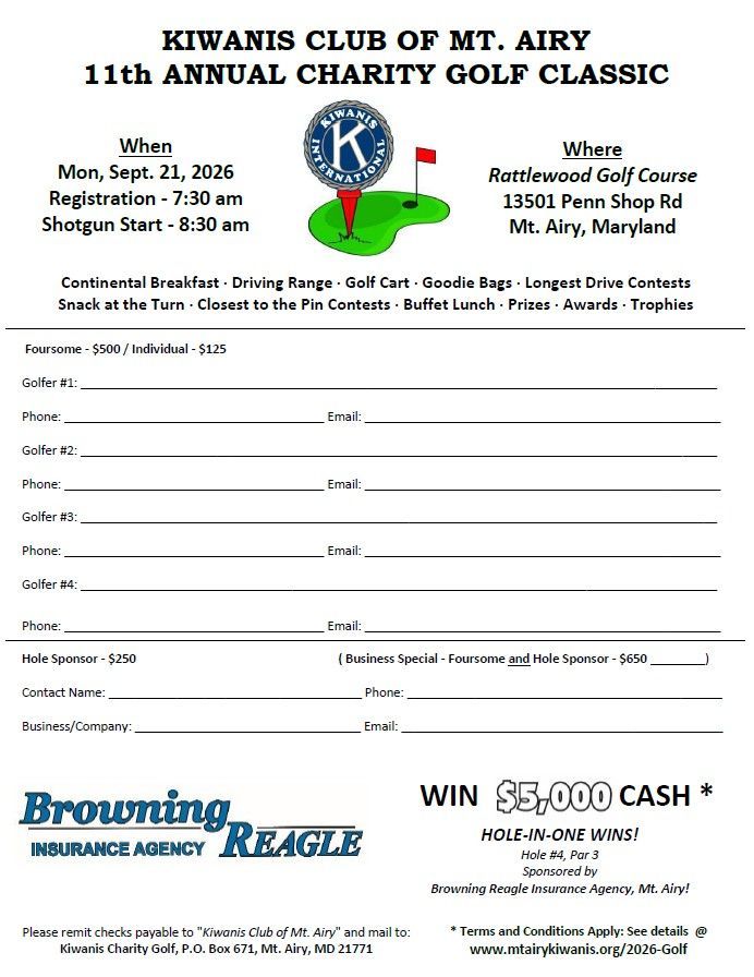 Please submit checks made out to 'Kiwanis Club of Mt. Airy' and mail to PO Box 671 Mt. Airy, MD 21771