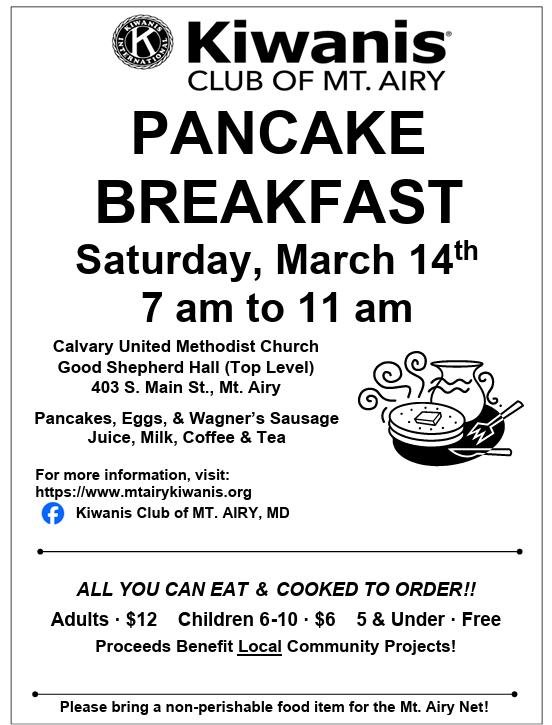 Join us for our Spring Pancake Breakfast on March 14th! Cost is $12 for adults, $6 for children 6-10, and free for children 5 and under. This all-you-can-eat breakfast includes pancakes (regular, chocolate chip, and blueberry), eggs (cooked to order), Wagner Meats sausage, and beverages. The proceeds will benefit local community service projects. Please bring a nonperishable food or toiletry item to donate to the Mount Airy Net